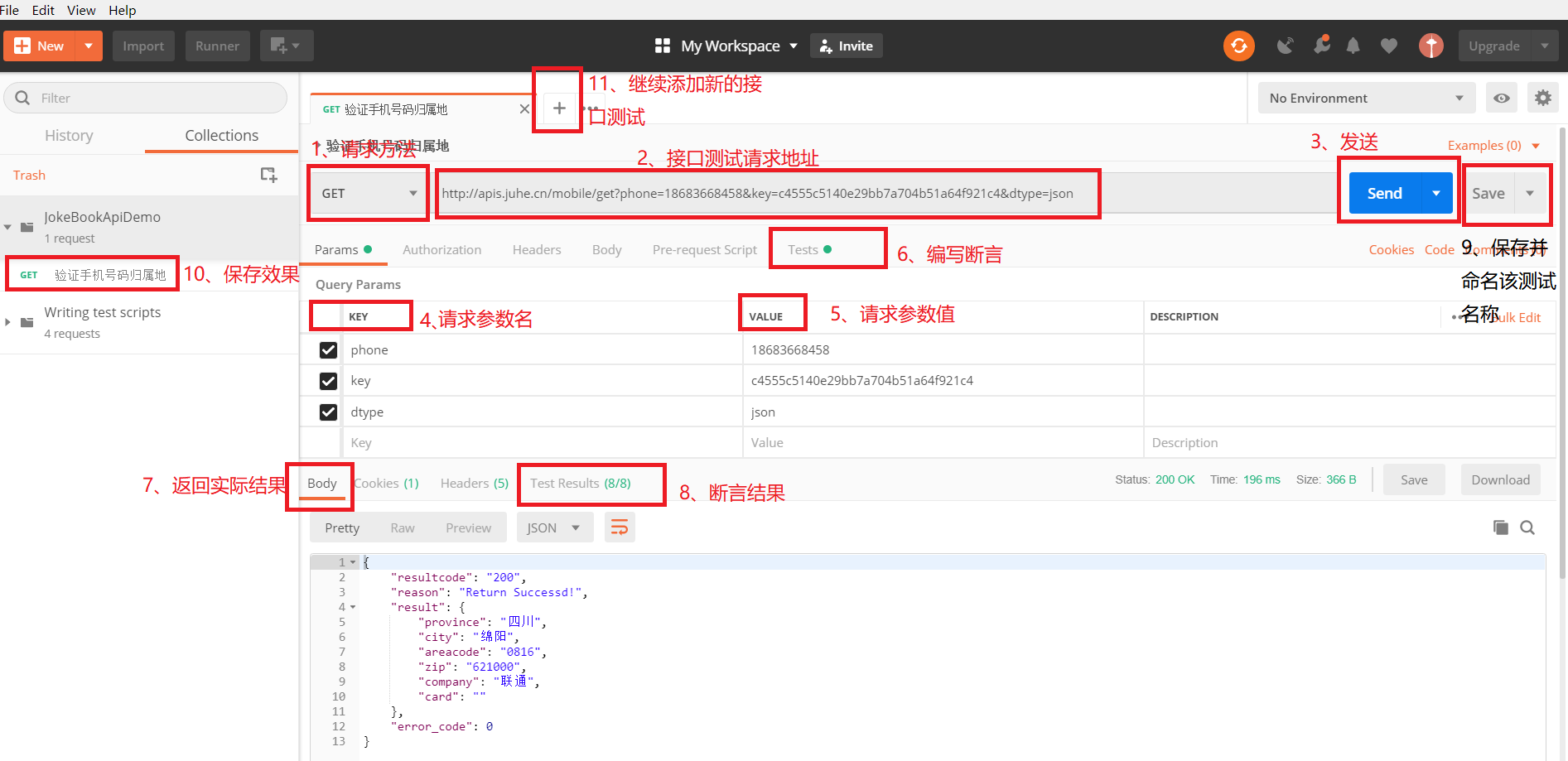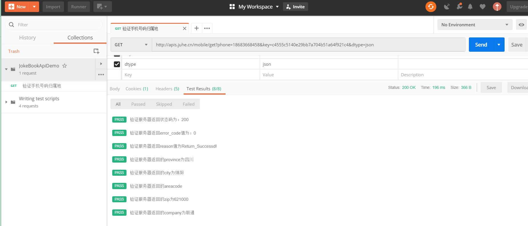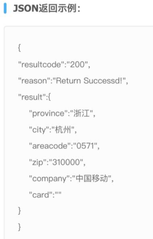 手机号码接口测试地址:http://apis.juhe.cn/mobile/get?phone=18683668458&key=c4555c5140e29bb7a704b51a64f921c4&dtype=json