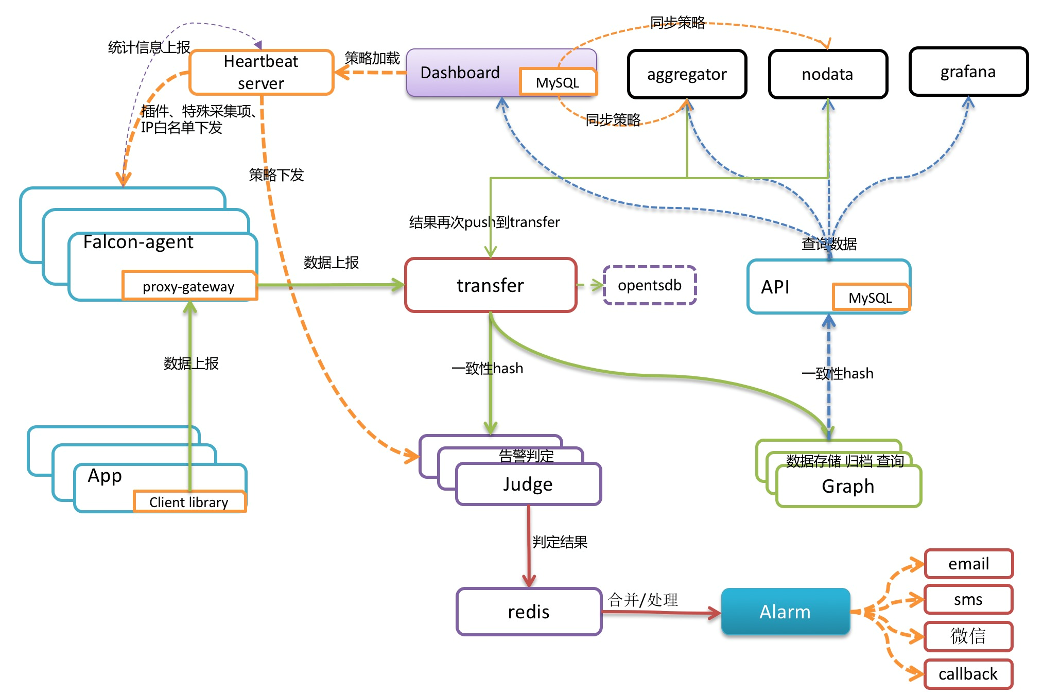transfer转发到judge的每条数据,都会触发相关策略的判定,来决定是否满足报警条件,如果满足条件,则会发送给alarm,alarm再以邮件、短信、米聊等形式通知相关用户,也可以执行用户预先配置好的callback地址。